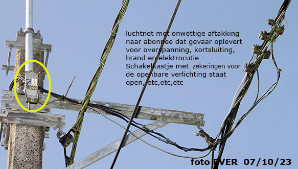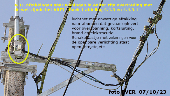Geen enkele elektrische aftakking van het openbaar net naar de abonnees voldoet aan de wet en levert gevaar op voor overspanning, kortsluiting , brand en elektrocutie! Als er dan toch een kot afbrand dan komt de brandweer en de politie - lees politici in uniform - en dan wordt de oorzaak verzwegen ! Behalve wanneer deze redactier in de buurt is, of wanneer wij worden ingeschakeld zoals dat al met twee dodelijke slachtoffers wegens schuld van Electrabel het geval was.