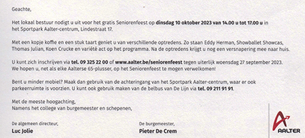 Na de recente uitnodiging van de nieuwe bewoners pakt Aalter op 10 oktober 2023 in het Sportpark van Aalter uit met een seniorenfeest. Aalter laat ook elke week -44 keer per jaar- glosso reclamedrukwerk op de vloermat vallen, dergelijke feitelijk permanente verkiezingspropaganda van de Neo-dictatuur rond Pieter De Crem -CD&V- gaat uiteraard allemaal op kosten van de Aalterse belastingbetaler, het is heel straf dat politici zichzelf op kosten van de belastingbetaler mogen promoten.