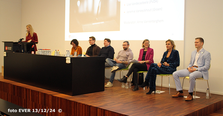 Foto panel politici : Van links naar rechts : VRT Wetstraatjournaliste Anne Vanrenterghem, Lise Vandecasteele PVDA, Hannes Anaf Vooruit, Jeremie Vaneeckhout Groen, Nigel Chantrain Open-Vld, Sofie Mertens CD&V, Kathleen Depoorter N-VA, Michiel Awouters Vlaams Belang. Telkens stellen wij vast dat sprekers van de PVDA, zoals vorig jaar Jos D'Haese, op veel meer applaus uit de zaal kunnen rekenen dan de andere politieke kleuren in het panel. Zegt dat soms veel over de politieke kleur van de UAntwerpen ?